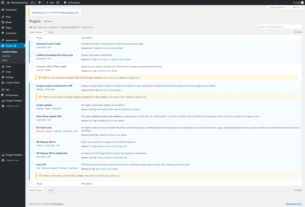 Some of these plugins are crucial for performance, especially the plugins that provide compression of image files and caching services. Other plugins, however, do not offer benefit unless the WordPress theme is developed to include the additional features provided by a plugin. Such as ACF (Advanced Custom Fields), Google Analytics Dashboard for WP and Velvet Blues Update URLs.